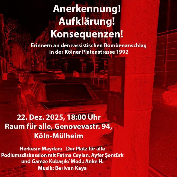 Am 22. Dezember 1992 fanden Bewohner*innen eines Hauses in der Platenstraße in Köln-Ehrenfeld ein in Weihnachtspapier eingepacktes Paket vor ihrer Wohnungstür, das an sie persönlich adressiert war. Beim Öffnen explodierte ein Zündmechanismus und eine Stichflamme verletzte zwei Personen schwer.