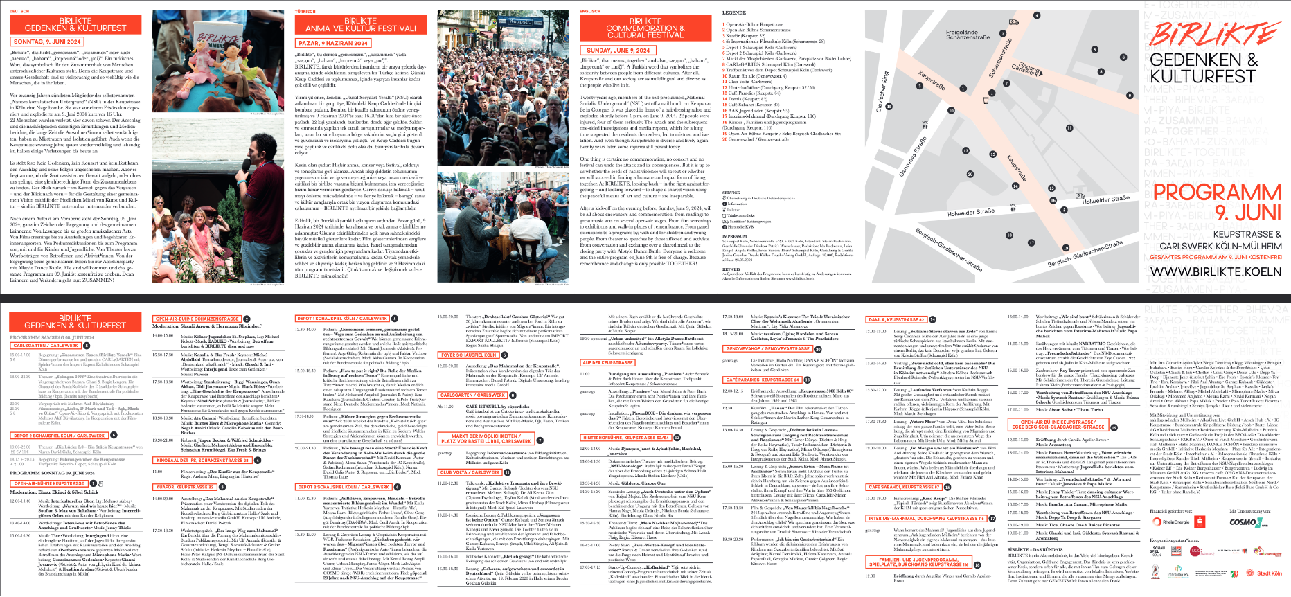 „Birlikte“, das heißt auf Türkisch „gemeinsam“ oder „zusammen“. Die Keupstrasse und unsere Gesellschaft sind so vielsprachig und vielfältig wie die Menschen, die in ihr leben. Aus Anlass des 20. Jahrestag des Nagelbombenanschlags in der Keupstraße laden Betroffene, das Schauspiel Köln, die Initiative Herkesin Meydani und viele andere Kölner Institutionen und Initaitiven zu einem Gedenkfest nach Mülheim ein.
