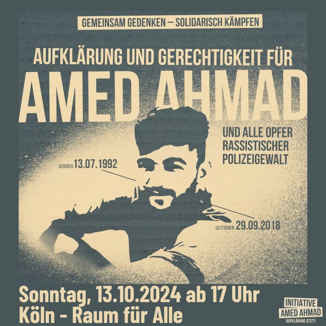 kommt am Sonntag, den 13.10.24 ab 17 Uhr zum Raum für Alle nach Köln Mülheim und lasst uns gemeinsam an Amed Ahmad gedenken. Am 29. September 2024 jährte sich zum sechsten Mal der Todestag von Amed Ahmad, am 13.10.2018 wurde Amed auf einem Friedhof in Bonn beigesetzt. Bis heute fehlt es an umfassender Aufklärung, warum Amed Ahmad in Geldern festgenommen wurde, seine Daten wenige Tage zuvor in der Polizeidatenbank manipuliert wurden. Es fehlen Antworten auf die Fragen, warum man Amed über zwei Monate in der JVA Kleve seiner Freiheit beraubte, obwohl bekannt war, dass er nicht der Gesuchte war, warum ein Feuer in seiner Zelle ausbrach und warum so spät auf seinen Notruf reagiert wurde.