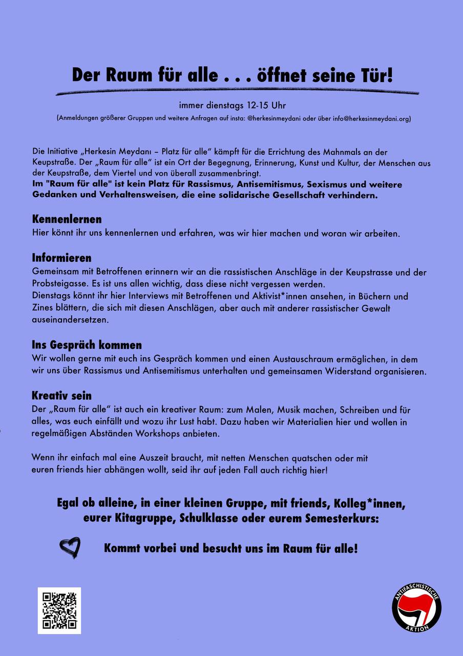 Die Initiative „Herkesin Meydanı – Platz für alle“ kämpft für die Errichtung des Mahnmals an der Keupstraße. Der „Raum für alle“ ist ein Ort der Begegnung, Erinnerung, Kunst und Kultur, der Menschen aus der Keupstraße, dem Viertel und von überall zusammenbringt.